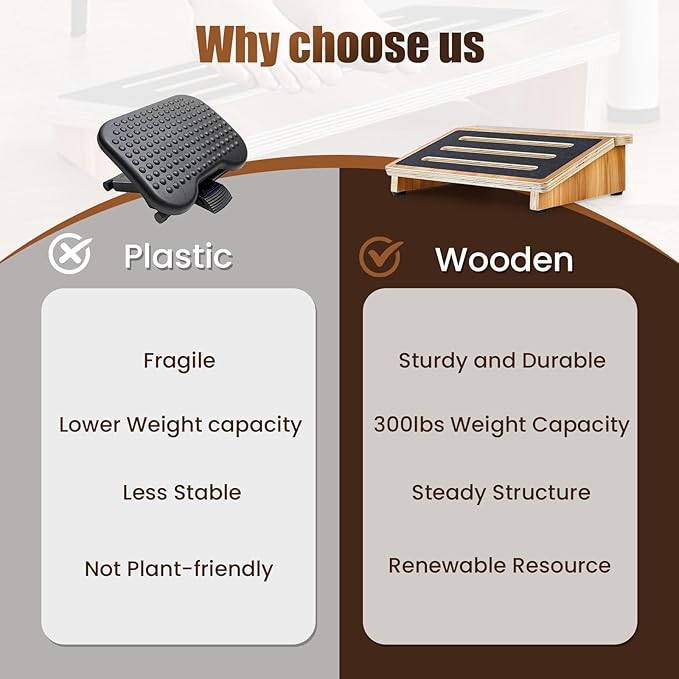 - Ergonomic Foot Rest for Improved Posture and Circulation: This wooden footrest is designed to reduce office fatigue and enhance sitting posture. By keeping your legs elevated, it helps prevent leg swelling, back pain, and poor posture, making it ideal for office desk use, home, and even gaming setups.