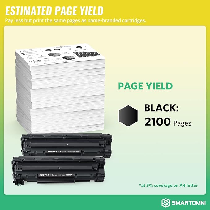 - Estimated Page Yield: Each black toner cartridge can print 2100 pages at 5% coverage of letter/A4 as usual
