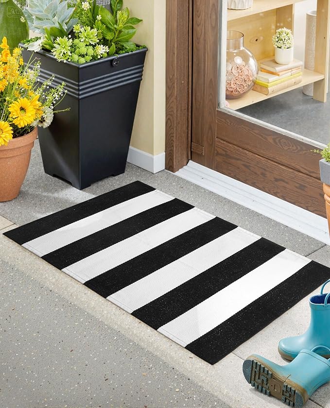 Black and White Striped Outdoor Rug 24"x 35", Washable Christmas Front Door Mat, Cotton Woven Farmhouse Front Porch Rug, Layered Door Mats Outdoor for Entryway Kitchen