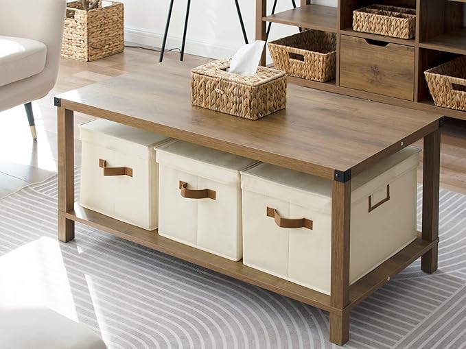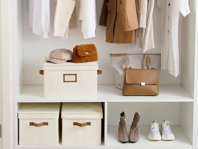 StorageWorks Storage Bins with Lids, Decorative Storage Boxes with Lid and PU Handles, Foldable Storage Baskets for Closet, Shelves, Stackable, Ivory White, Jumbo, 3-Pack