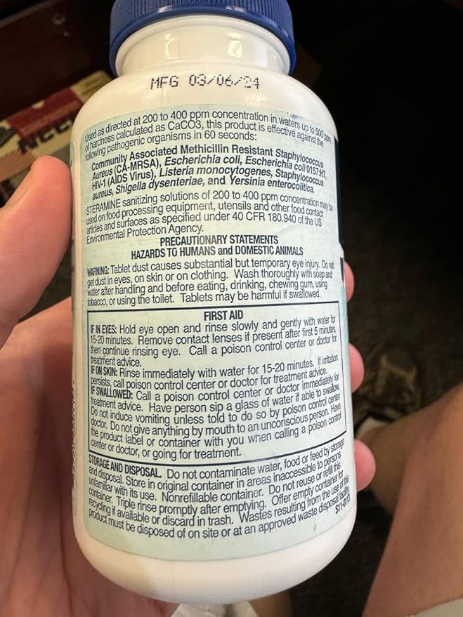 - HIGHLY EFFECTIVE SANITIZING SOLUTION FOR BARS, RESTAURANTS & FOOD SERVICE β Steramine sanitizing tablets provide a fast, powerful, and economical way to maintain a clean and compliant environment in food service operations. Just dissolve one tablet per gallon of water to create a ready-to-use sanitizing solution with a blue tint that confirms proper concentration. Each bottle yields up to 150 gallons, making it ideal for high-traffic restaurants, bars, catering services, and commercial kitchens.