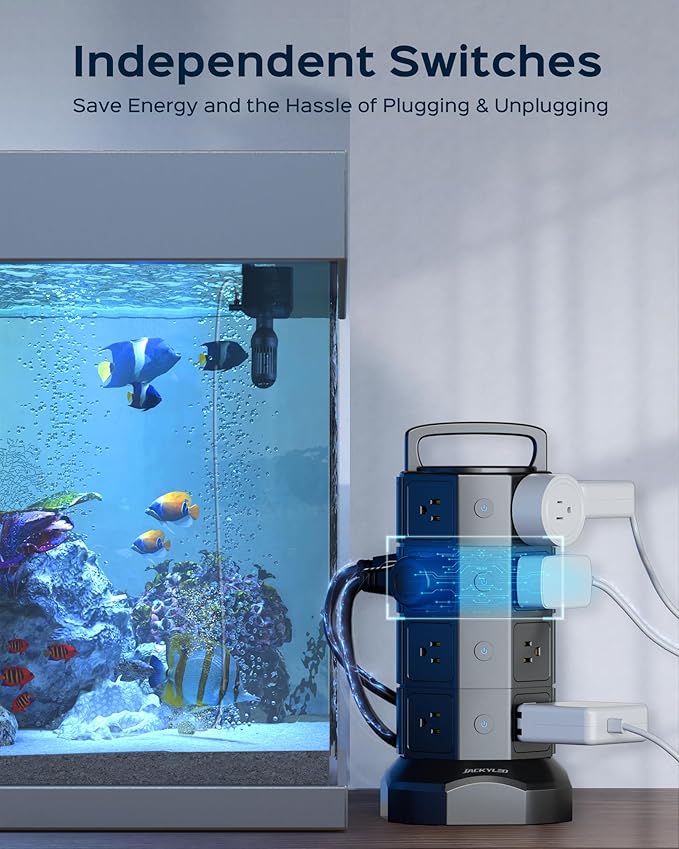 - ▶【Energy Saving and Space Saving】An independent switch is designed on each layer of this power strip with usb ports for you to manage the power of every device you plug in, especially those having on switch on them; efficient in power management with indicator inside switch to check its working status, saving those unnecessary waste of electricity. Besides, the vertical tower design of the power tower helps you save space, and keep your desk neat and tidy.
