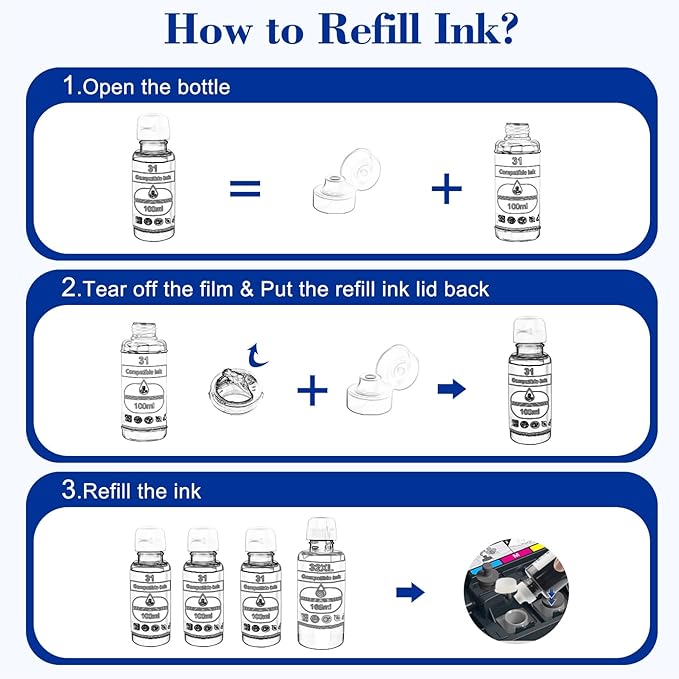 - Compatible Printers: Our inks are compatible with hp 31 xl ink for hp 32xl ink bottles can be compatible with hp smart tank ink printers. Compatible with HP Smart Tank 7301 7001 7602 5000 6001 5101 5102 5103 printers, compatible with HP Smart Tank 450 455 457 517 532 502 514 printers, compatible with HP Smart Tank Plus 551 555 557 559 651 655 617 570 571, compatible with HP Ink Tank 310 319 410 415 416 418 419; And compatible with HP DeskJet GT-5810 GT-5820 GT-5822 printers