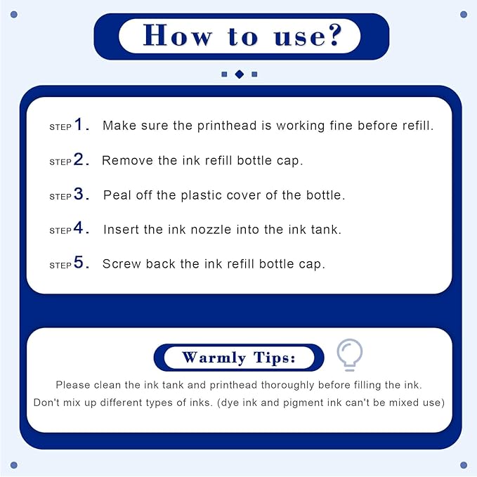 - Note: Pristar inks compatible with HP 31 32XL Refill Bottle Ink are dye inks, which are different from OEM black pigment ink, the color is dye ink. Please clean the ink tank and printhead thoroughly before filling the ink, because dye ink and pigment ink can't be mixed-use. And in order to get better print quality, please adjust your print mode to hig h quality printing before printing