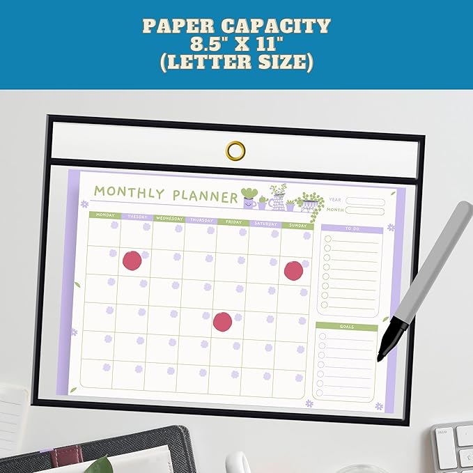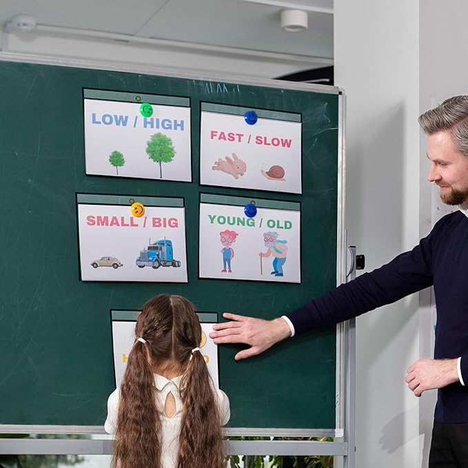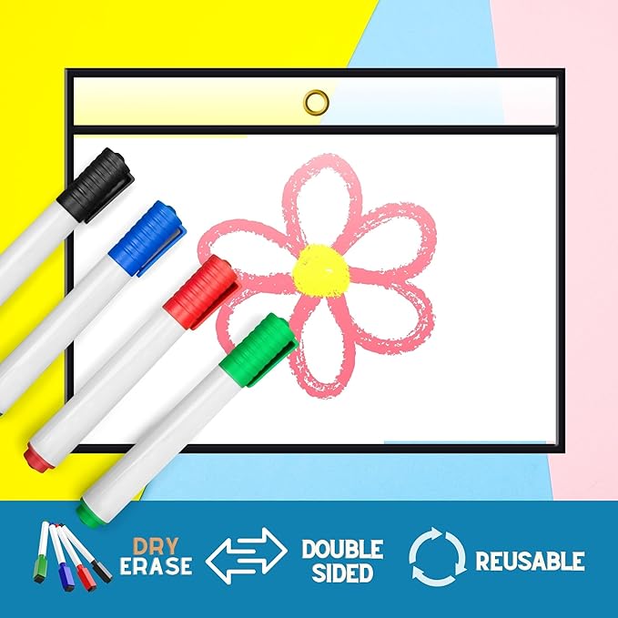 - Durable and Long-lasting — Our Dry Erase Pockets are made of heavyweight plastic to withstand daily usage of classroom, office and work. The edges of each pocket are stitched that makes them durable. Each sleeve measures 11" X 8.5" in a landscape view and features one metal eyelet which allow easy hanging. These worksheet sleeves are made to last!