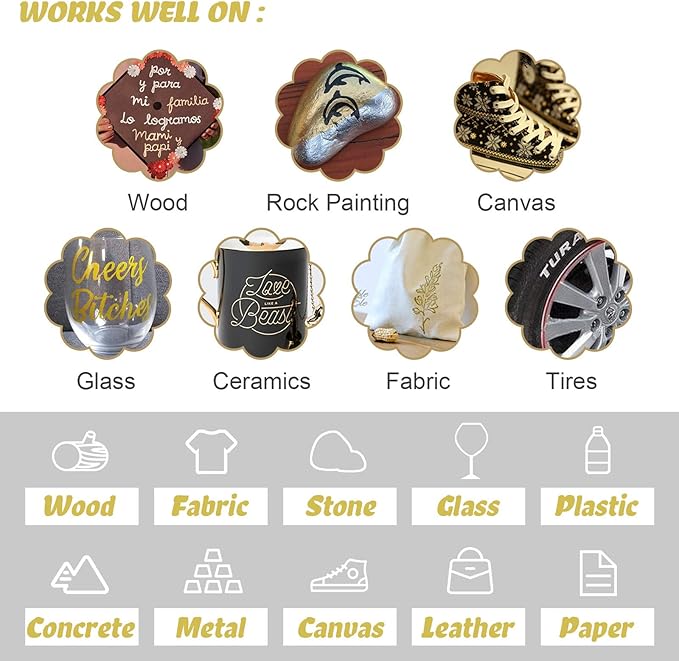 - 【High Quality and Safe】Package with 3 pcs Gold+3 pcs Silver color. Acrylic paint pens are made with high quality abundant oil ink, High purity color, strong covering force,waterproof, fade proof, non-bleeding. non-toxic, no odor, no strong smell. Conform to ASTM D-4236 & EN71-3.