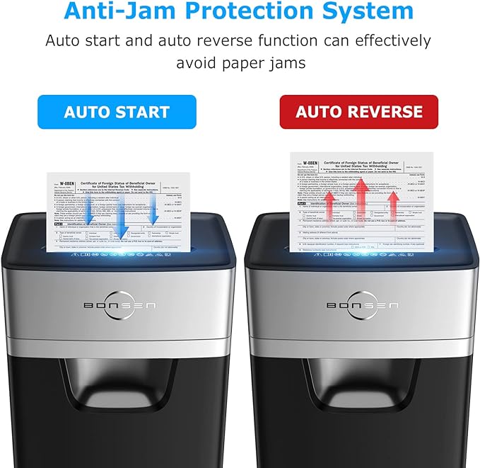 - JAM PROOF AND EASY OPERATION: The heavy duty shredder is equipped with auto start and auto reverse functions to eliminate paper jam. Easy operation with light indication, overheating and overload protection to help you use and prolong shredder's service life
