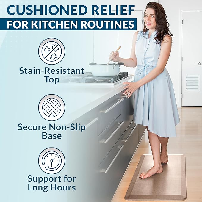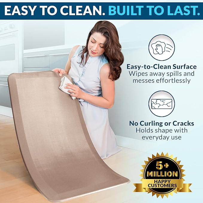 - Slip-Resistant and Stain-Resistant Surface: Stay safe and clean with our anti fatigue mats for kitchen floor that feature a non-slip backing to keep it securely in place. The stain-resistant material is easy to clean and ensures your mat looks new, even with daily use.
