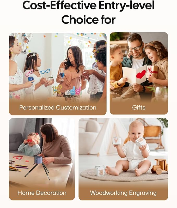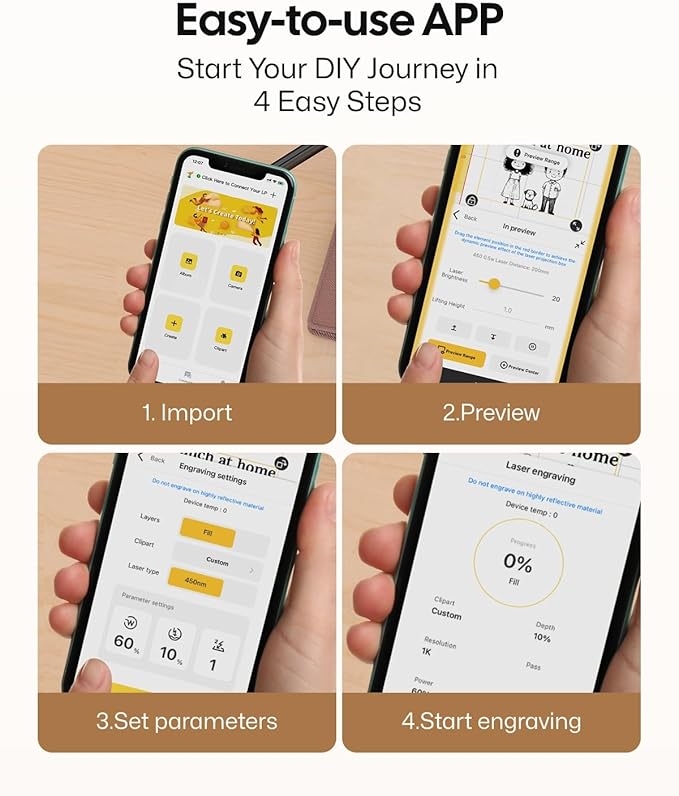 - 3-Step Wood Engraving - No Experience Needed: ① Bluetooth connect ② Set 20cm height ③ Upload designs. Create custom wooden tags/plaques in 4x4" area - 5x faster setup than similar tools.