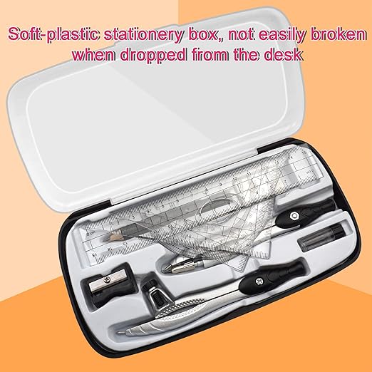 - Complete Geometry Kit: comes ready-to-use tools including 2 durable geometry compasses for circles and arcs, a 180-degree protractor, 2 set squares (30°/60° and 45°/90° triangles), and a straight edge ruler; everything students need for math class, engineering drawing, and technical drafting.