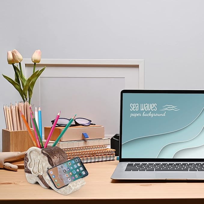 - Multi-Functional: Our desk organizer can be used as cell phone stand, pencil holder, desk decorations and makeup holder. The elephant trunk holds a cellphone and the compartment holds pencils, scissor, paint brushes, etc.