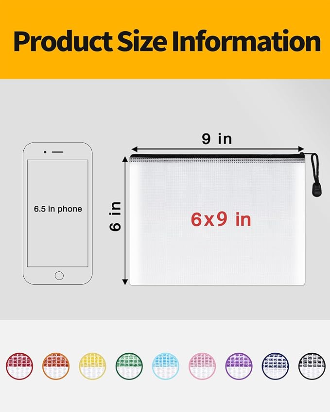 - PACKAGE CONTAINS: You will get a set of 18 Packs 6x9 inches multi-colored plastic zipper pouches for the most paper size of letter-size prints or smaller document storage. It can help you organize your miscellaneous items to meet your daily life and work. Manufacturer recommended age 3 years and up