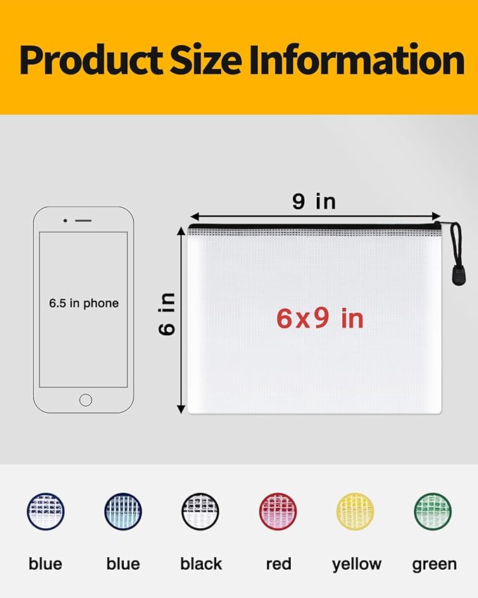 SUNEE Plastic Mesh Zipper Pouch 6x9 in (Black, 18 Packs),Extra Large Water-Resistant Zip Bag for School Office Supplies, Puzzles & Games Organizing Storage