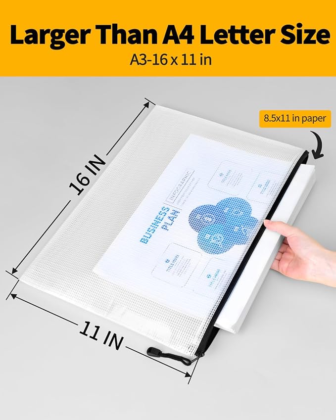 SUNEE 18pcs Plastic Mesh Zipper Pouch, A3, Extra Large, 16x11 in, Water-Resistant Zip Bag for School Office Supplies, Puzzles & Games Organizing Storage (Black, 18 Pack)