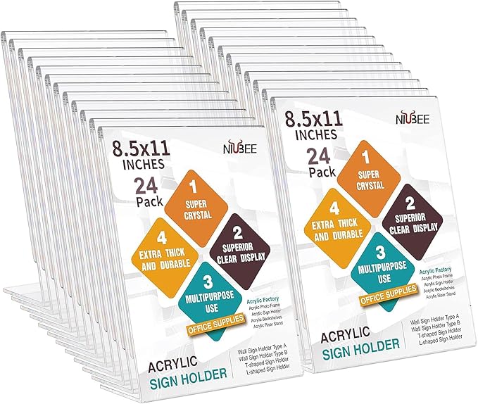 NIUBEE 24 Pack Acrylic Sign Holder 8.5 x 11 Inches Slanted Back, Clear Plastic Sign Holder Paper Display Table Stand for Office, Store, Restaurant