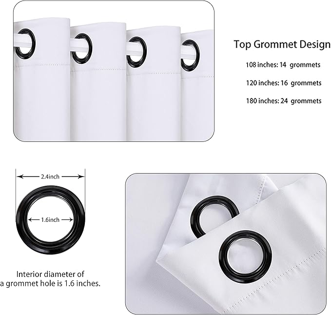 - WHAT'S IN THE PACKAGE? Each set includes 1 curtain panel, and each window drape measures 96-inch (8 ft) length by 108-inch (9 ft) width. 14 elegant metal grommets with 1.6-inch inner diameter, fit well with standard or decorative curtain rods, which makes the curtains easy to install and slide.