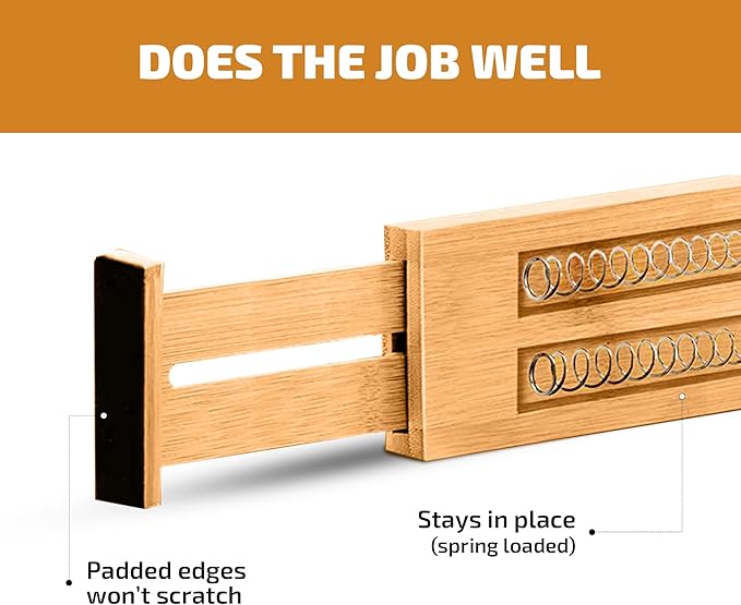 - STRONG SPRING: The drawer separators really bring organization into your home, because they don’t wobble or move out of place. With the spring mechanism and foam padding, the wood dividers stay firmly in place.