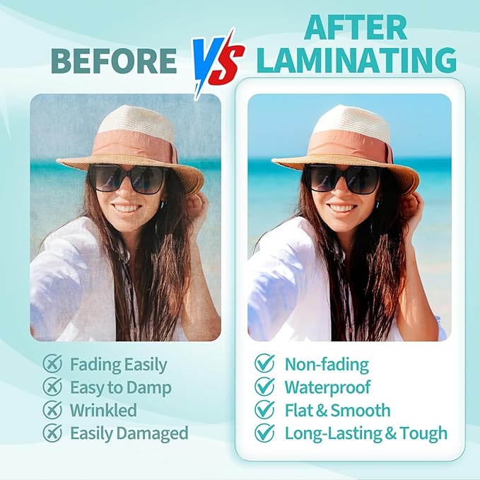 - 【High Transparency】 Made from top-quality PET material, these thermal laminating pouches deliver a crystal-clear, high-gloss finish, offering vibrant visibility for photos and documents. They protect against bends, creases, and dirt, with features like crease-proof, dirt-resistant, and anti-static for dependable, lasting document preservation.
