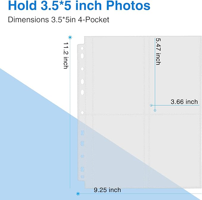 - 30 Pack Photo Sleeves: 11.2 x 9.25" photo album pages with 11-hole punched fit for 3 ring binder and other different kinds of ring binders or albums. The 3.66''x 5.47'' Pockets Perfect for 3.5''x 5'' or smaller photos or cards, 4 pockets per page, up to 8 photos with 2 inserted back-to-back, totally can hold up to 240 photos or cards.