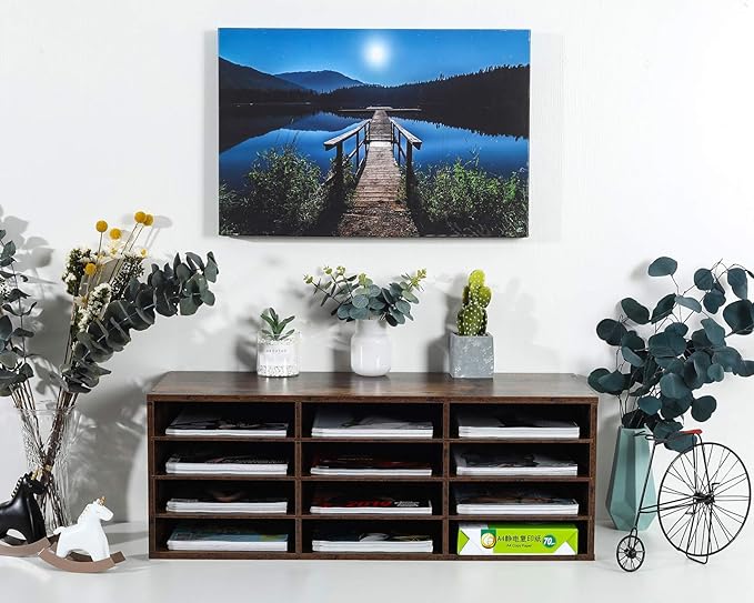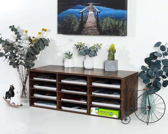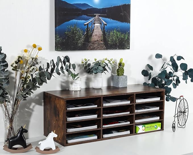 PAG Mail Sorter Organizer, Wood Countertop Literature Organizer, Student Mailbox for Classroom, Desktop Bill Paper Organizer for Office Home School, 12 Compartments, Antique Brown