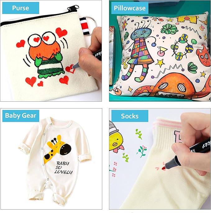 - VERSATILE USES: Premium quality fine tip fabric markers work on all type of light-colored fabrics like T-shirts, canvas, socks, hats, bags, baby gears and more. It’s really a great art and craft supplies for kids!