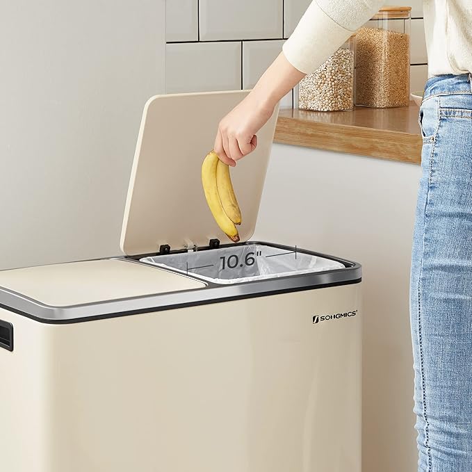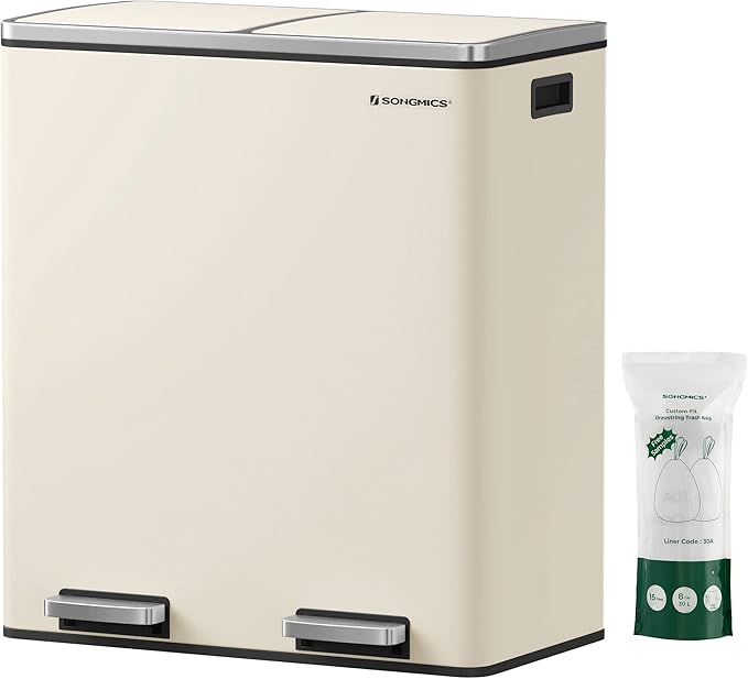 SONGMICS Trash Can, 2 x 8 Gallon (2 x 30 L) Garbage Can for Kitchen, with 15 Trash Bags, 2 Compartments, Plastic Inner Buckets and Hinged Lids, Airtight, Almond Color ULTB201A01