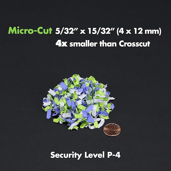 - Shreds Paper, CDs, DVDs, credit cards, junk mail into small pieces (5/32 by 15/32 inches), security level P-4