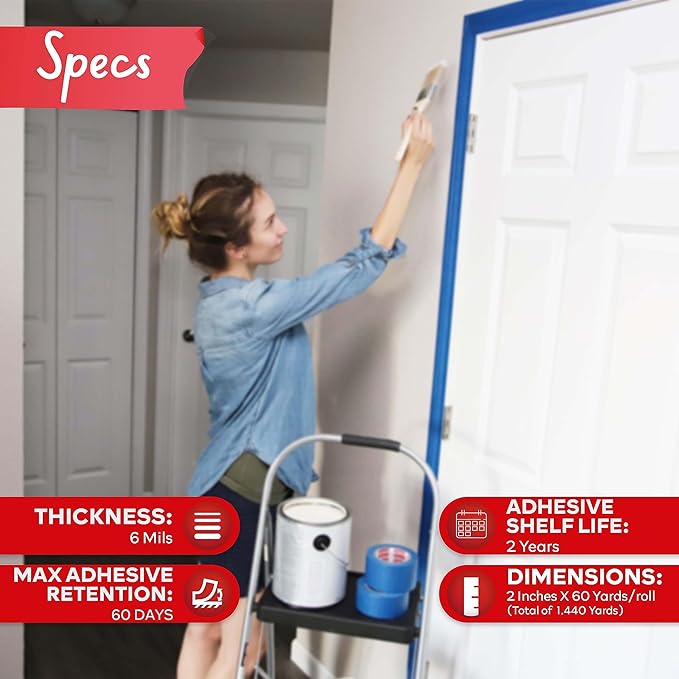 - INDOOR AND OUTDOOR HEAVY-DUTY ADHESION. Have you been frustrated with other generic or named brands claiming to have reliable adhesion but you just end up having a blue tape that barely sticks to anything and peels off hours after it has been mounted? With our special silicone-acrylic adhesive blend, our blue painter’s masking tape can stick up to 60 days, even under prolonged exposure to elevated temperature, UV and moisture. This is the perfect masking tape for painting!