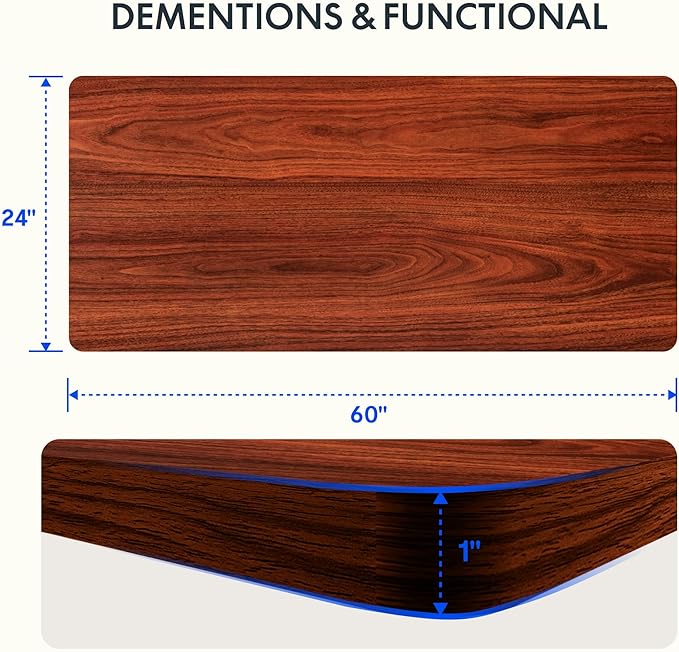 - AMPLE WHOLE-PIECE DESKTOP: With its whole-piece 1β eco-friendly desktop, this standing desk provides plenty of room for your computer setup, documents, and accessories, creating a well-organized and productive work environment. Due to hand measurements, desktop dimensions may vary slightly by 0 to 1β.