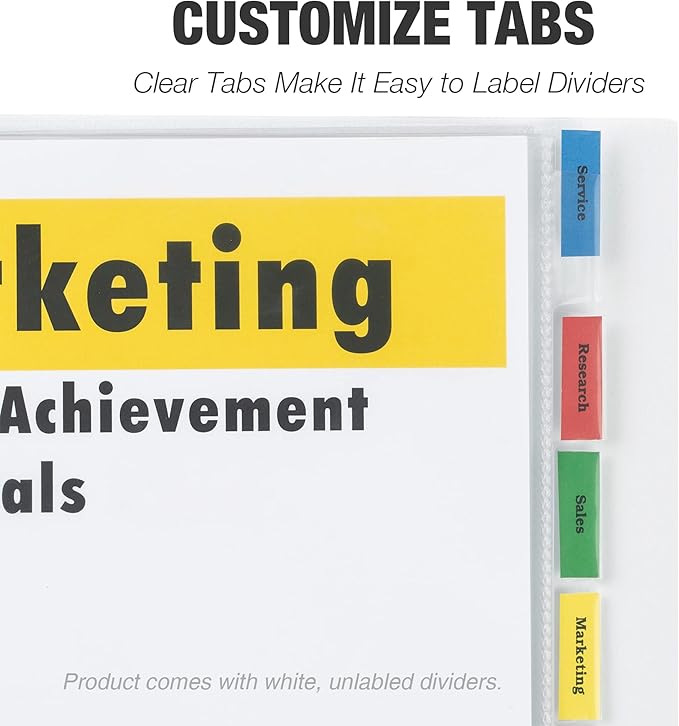 - Customizable Tabs. Each set includes 26 paper labeling slips that slide into the clear tabs, allowing you to easily create labels or write directly on the tabs with a permanent marker to customize training manuals, board books, etc.