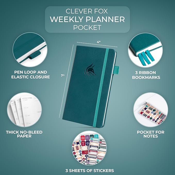 Clever Fox Pocket Planner Weekly – Undated Monthly Goal Planner and Calendar, Mini Planner Perfect for Purse, 3.7x6.7" (Dark Teal)