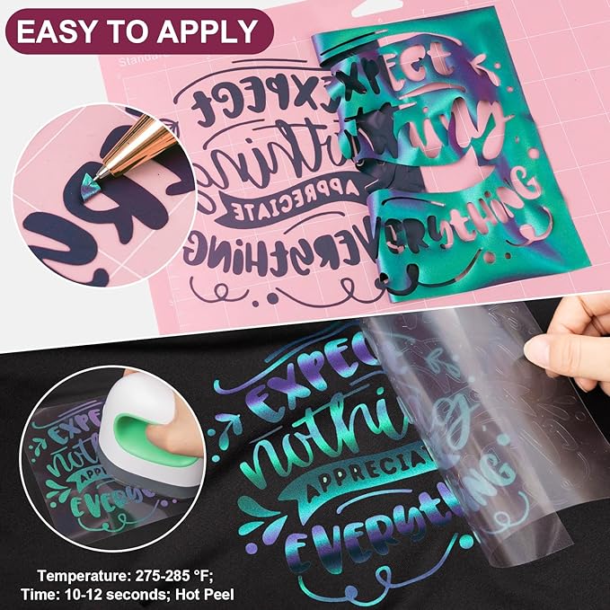 - ✂️EASY TO APPLY: Just use craft cutter and a home iron to get the job done. Apply for approximately 10-12 seconds at 302-320 °F (150-160 °C) and about 10 LBS of pressure. Be sure to cold peel.