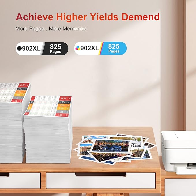 - Higher Page Yield Replacements Ink for HP 902xl color combo pack: Up to 825 pages per 902xl Color cartridge ( at 5% coverage )