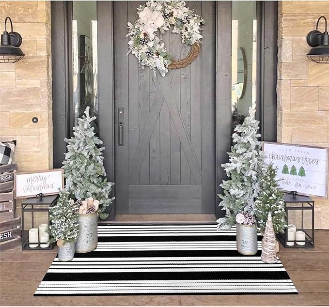 OJIA Black & White Outdoor Rug 3x5 Cotton Hand-Woven Christmas Striped Porch Rugs Machine Washable Entry Rug Indoor Outdoor Area Rug Front Door Rug Floor Mat for Farmhouse/Living Room/Home Entrance