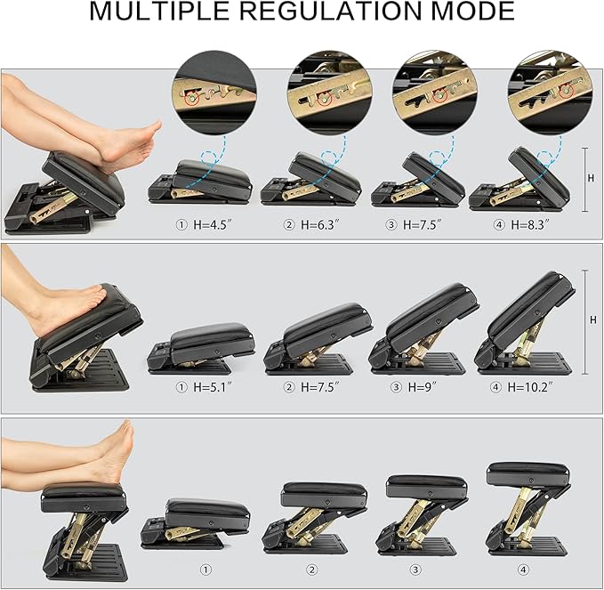 - š¦¶ćAdjustable Height and Anglećļ¼The foot rest has 4-level adjustable gear functions. You can adjust the height and angle of the under desk footrest according to your own conditions. Very easy to find the perfect position to suit your needs.