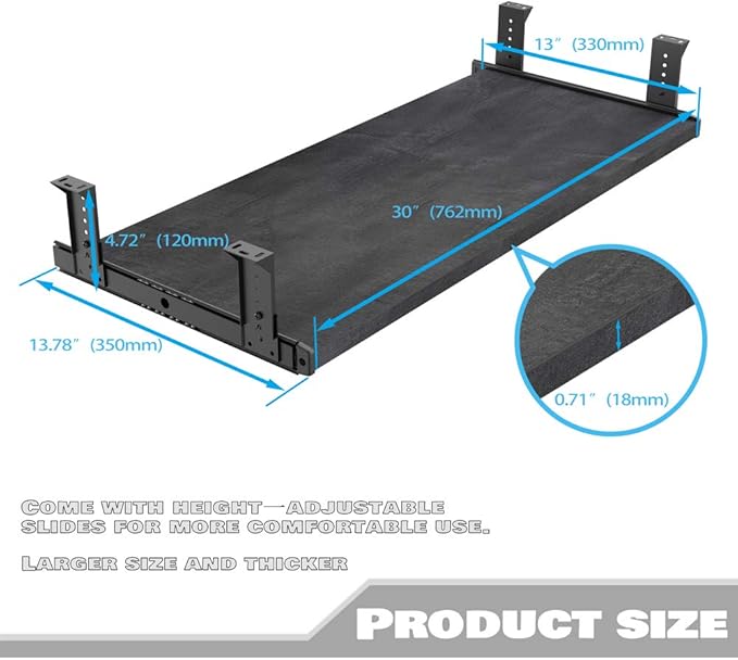 - EXTRA WIDE:It can accommodate most keyboards and mice, saving desktop space. Equipped with heavy-duty 14-inch ball bearing 3/4 extended keyboard slide. Reducing clutter and freeing up the top of your desk. Suitable for desks over 0.67 inches thick.