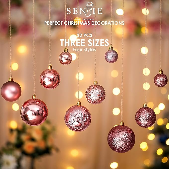 Senjie Rose Gold Shatterproof Christmas Ornaments, 32 Pcs, Plastic, Hanging, Christmas, Wedding