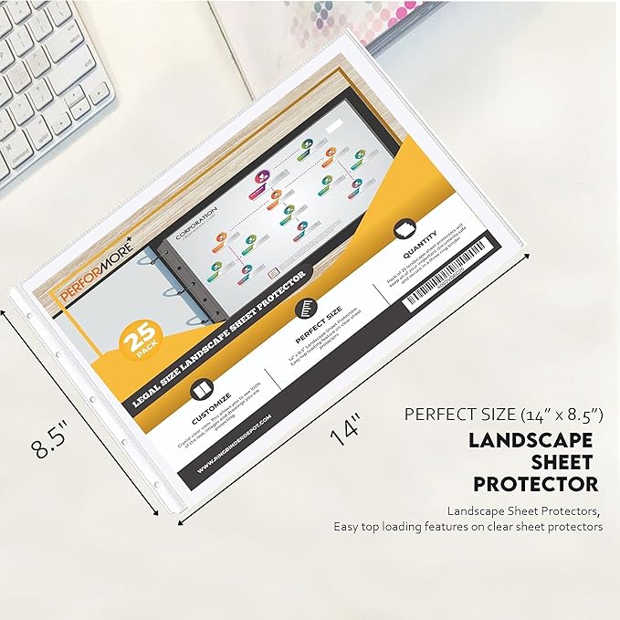 PERFORMORE Pack of 8.5” x 14” Heavyweight Landscape Sheet Protectors, Legal Paper Sleeves, Clear Archival Quality, Horizontal Legal Size Clear Sheet Protectors for Binders Documents (25)