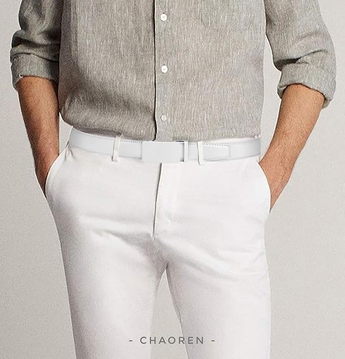 - Effortless to Use: Experience the ultimate convenience with our white leather belt. Simply slide it into the sliding buckle, pull it through, and the click-it buckle automatically locks in place. Releasing the belt is just as easy - gently push the lever on the side of the automatic buckle, and the lock snaps shut. Enjoy the seamless simplicity and smoothness of our ratchet belt design.