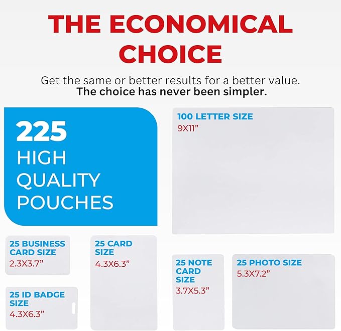 5MIL Thermal Laminating Sheets (225 Count) Letter, Photo, Card, Notecard, ID Badge and Business Card Sizes, Laminating Pouches, Compatible with Laminators, Crystal Clear Laminated Finish