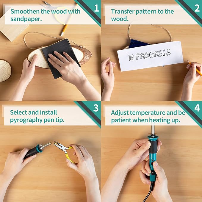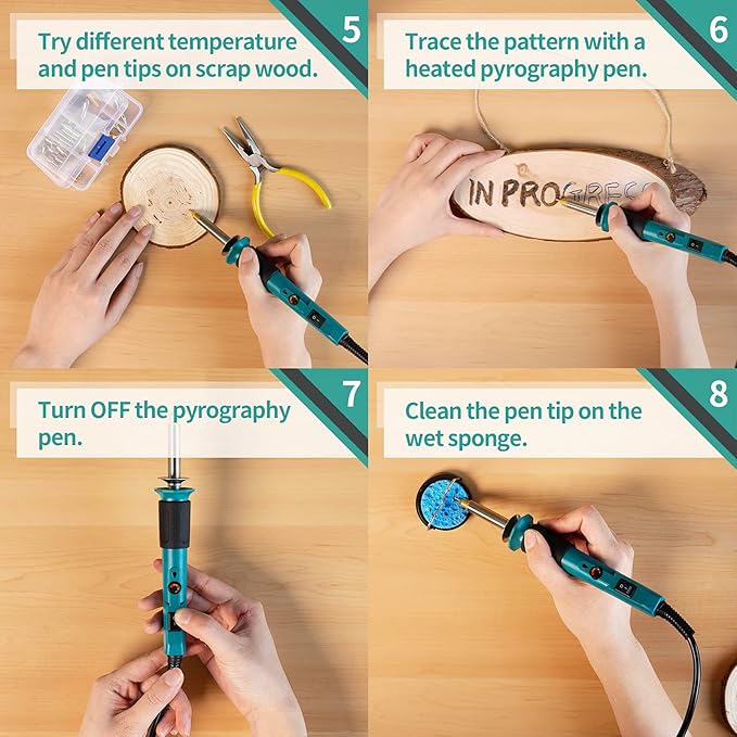 - Complete Pyrography Kit - We packed this kit with the basic items you’ll need to get started in pyrography, you can enjoy the fun of wood burning with a safe, adjustable, and lightweight wood burning tool. Caution: Tighten the pyrography tip, and remove the silicone cover before use