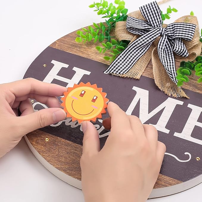 - INTERCHANGEABLE WELCOME SIGN β The seasonal welcome sign porch decor is about 12 x 12 x 0.8 inches, features 14 styles of holiday pendants with star flag, love, clover, Easter chicken, maple leaf, cake, home, football, pineapple, pumpkin, sun, sunflower and Christmas tree, you can change each accessory according to your needs to welcome each season with a different feeling.