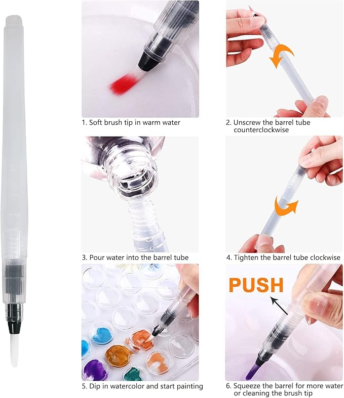 - BRUSHES+PENS+TAPE+SPONGE - With 10 sizes of paint brushes and 4 refillable water brush pens with various shapes, you will have the perfect brush for art. The tape can mask the paper edges and the sponge can be used to wet the paper or lift out paint.