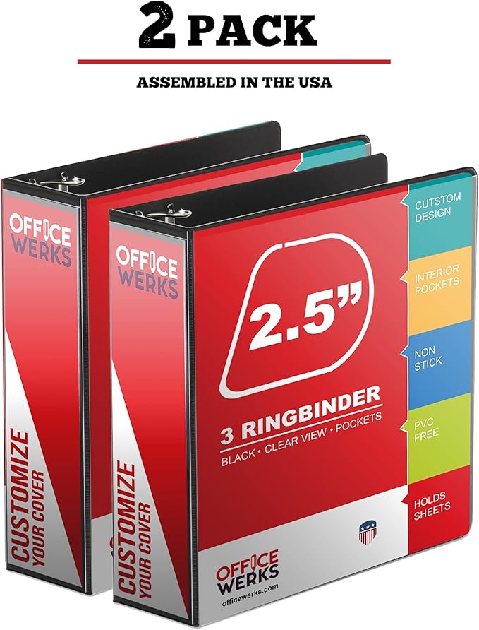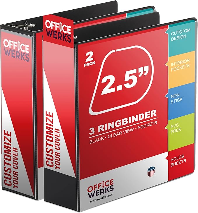 - Premium Quality - 2.5" Angle-D Ring three ring binder comes with two opaque interior pockets. Strong gap-free binder rings keep your papers securely in place. All 3 sides are customizable for a coordinated look, front, back and spine. Assembled in the USA