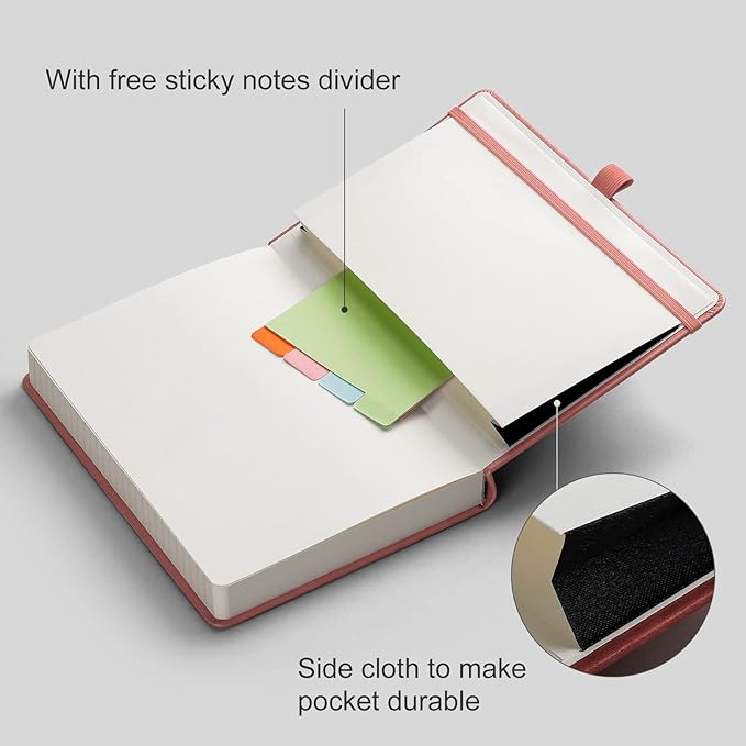 - Humanized Design: Numbered pages, divider sticky notes, index content pages, and 2 bookmarks help you find important content faster. Durable PU leather hardcover protects the ruled notebook from wear and tear. Back inner pocket can hold notes, business cards, small gadgets, etc. Closes with an elastic band and pen holder loop for any pen
