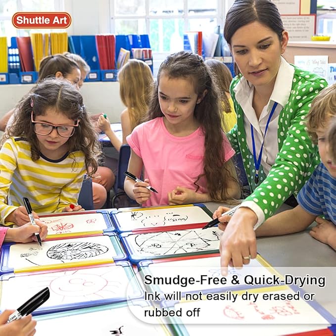 - WET-RUBBING: Shuttle Art wet erase markers are water based ink, can be wipe with a damp cloth or tissue easily and cleanly without smudges. Water based ink are odorless,non-toxic and acid-free, conforms to ASTM-D4236, safe for kids and adults.