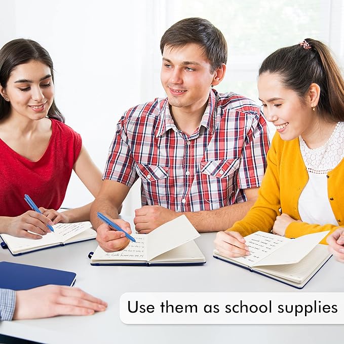 - Feela 5 Pack Classic Ruled Notebooks contains 5 classic navy ruled sturdy cover notebooks and 5 Black Retractable Pens. Each of the notebooks measures 8.3” x 5.1”, which is perfect to carry and easily held by young girls and boys. These black cute pens are customized to be placed in the pen holder, which is pretty convenient.
