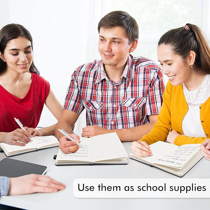 - Feela 24 Pack Classic Ruled Notebooks contains 24 classic gray ruled sturdy cover notebooks and 24 Black Retractable Pens. Each of the notebooks measures 8.3” x 5.1”, which is perfect to carry and easily held by young girls and boys. These black cute pens are customized to be placed in the pen holder, which is pretty convenient.
