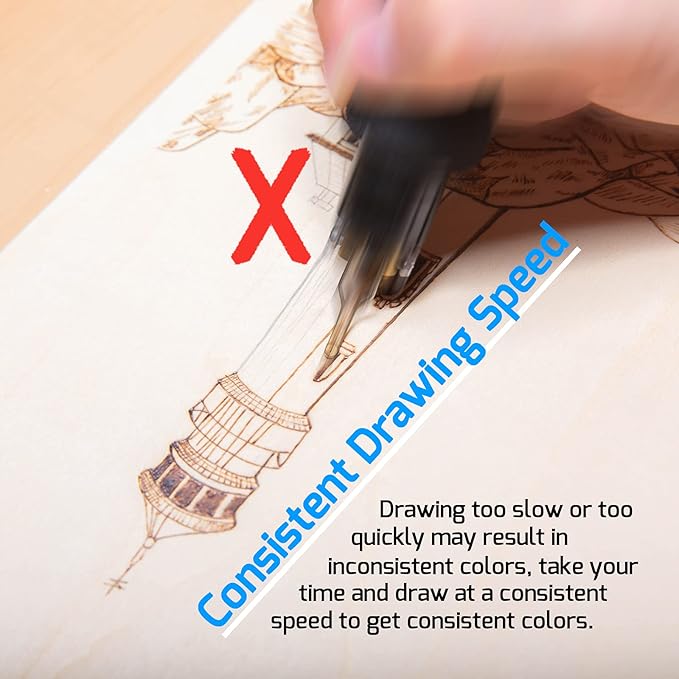 - This woodburner has two detachable wood burning pens that are different from each other, and can be turned ON at the same time. The solid-point pyrography pen is great for heat-transfer, shading, outlining and more. The solid-point pen comes with an adjustable temperature from 200°C ~480°C, and the temperature setting is shown on the station’s digital display. NOTE: It takes about 2 to 3 minutes for the solid - point pen to heat up and 1 to 2 minutes for the wire - nib pen, please wait for the tip to heat up completely before drawing. You can learn more about pyrography in the WEP'S GUIDE TO PYROGRAPHY section of our brand store.