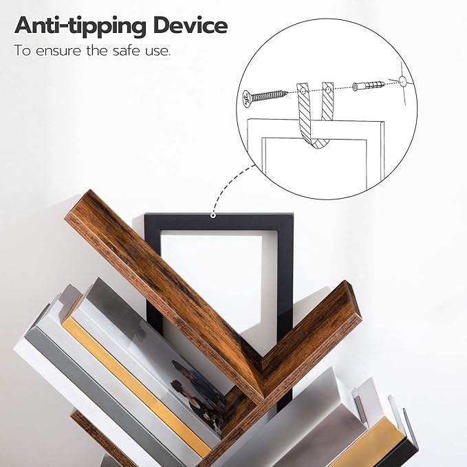 - Stable Structure: The tree bookshelf is made from high-quality particle board and metal frame, which is stable and durable. Equipped with the anti-toppling device, no matter where the book tree bookshelf sits, it can stand safely without worrying about tipping over
